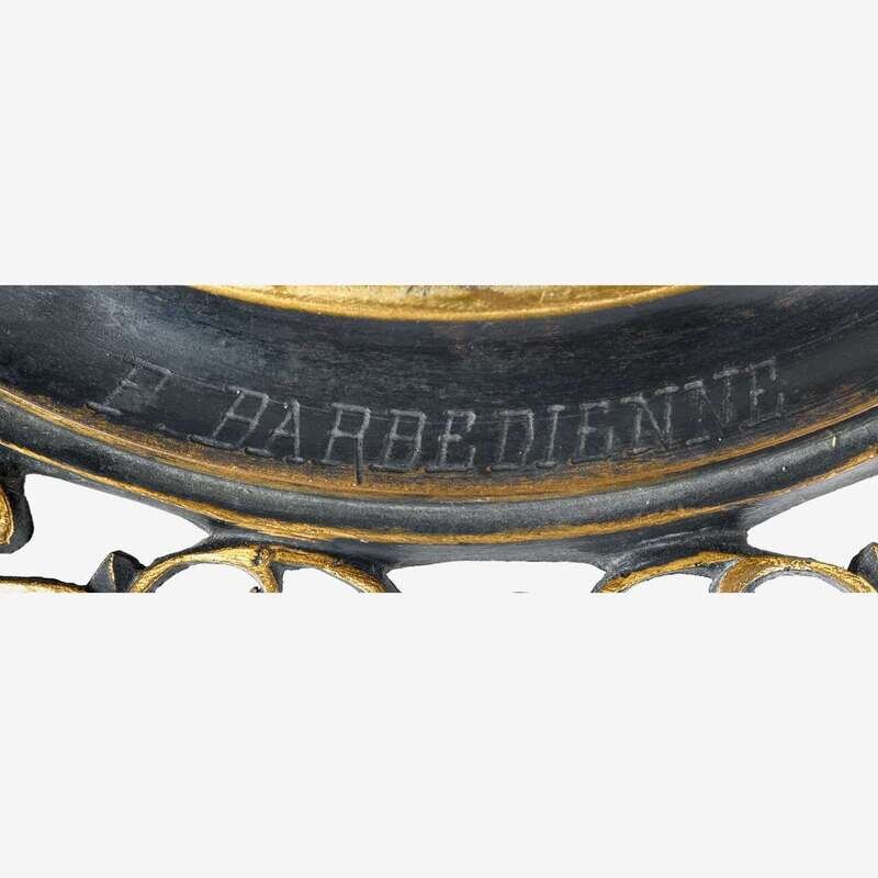 Each enameled in the chinoiserie taste with birds resting on flowering prunus branches, mounted with gilt bronze reticulated collar cast to show ruyi heads, dragons and shou symbols and raised on conforming reticulated base mounted with two upturned handles issuing loose rings and engraved F. Barbedienne, on four scroll feet. (2).
