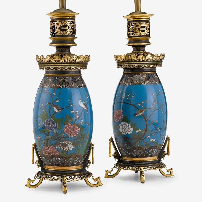 Pair of gilt and patinated bronze and cloisonné enamel table lamps late 19th century, F. Barbedienne, Paris