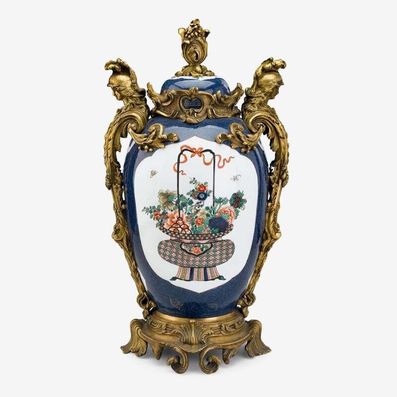 Domed lid surmounted by ormolu foliate finial, the ovoid form powder blue glazed vase with panels depicting baskets of flowering prunus flowers against a white reserve, mounted with female headed foliate term handles and reticulated C-scroll collar, raised on cylindrical base and foliate legs.
