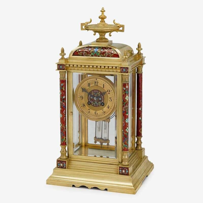 Circular dial with Roman hours signed Tiffany & Co. and ornamented with a center roundel enameled with foliate decoration on a guilloché ground, with mercury pendulum set within an architectural case with glazed sides and enameled columns at each corner, the movement marked Tiffany & Co., with Japy Frères pastille.