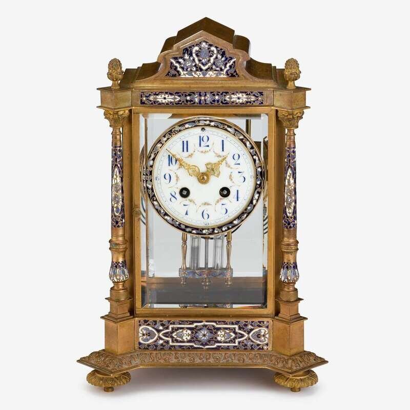 Circular dial enameled with Roman Hours and set within a champlevé frame with mercury pendulum, the case of architectural form with glazed panels to each side, surmounted by a shaped pediment and flanked by columns, all decorated in champlevé to show foliate panels, the movement marked H & H and Made in France.
