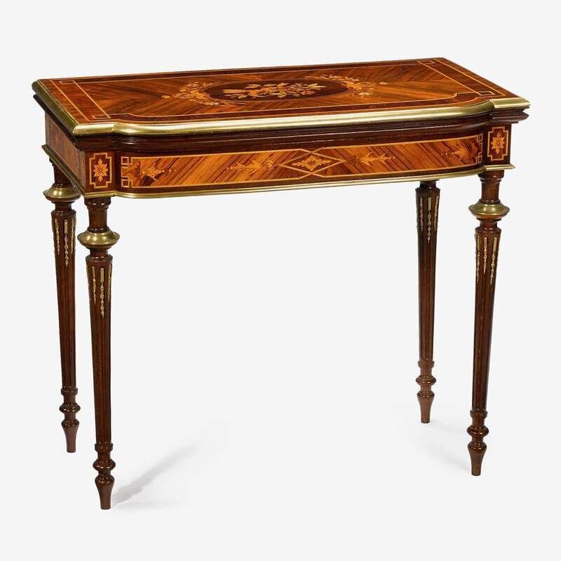 The shaped rectangular top with brass banded edge centrally inlaid with a quiver of arrows surrounded by a wreath of various flowers within a cartouche, opening to a felt lined playing surface, the frieze inlaid on all four sides to show bell flowers and foliate motifs, raised on fluted tapering legs with brass collars, the two back legs sliding out to to reveal a compartment bearing old inventory label pasted to interior.