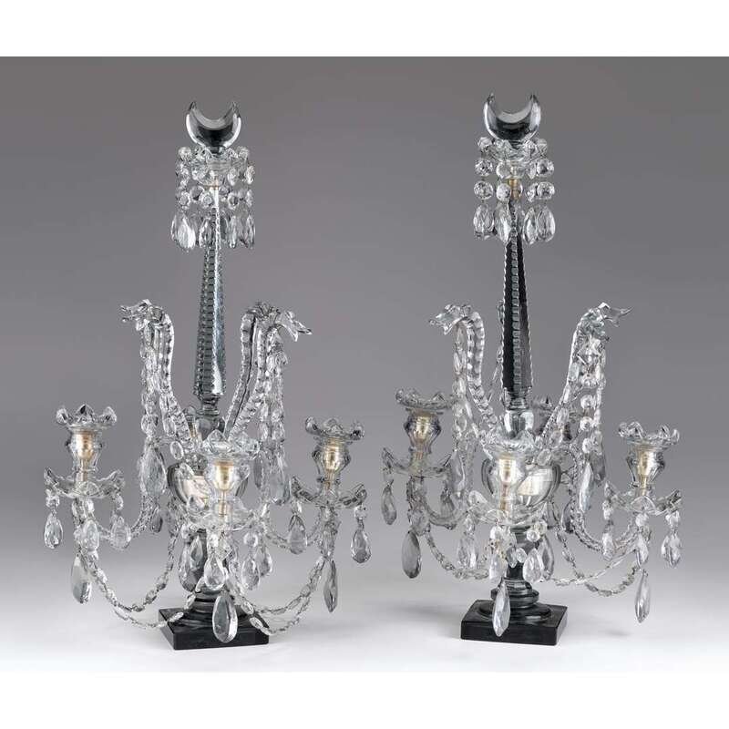 Baluster form stem supporting four candle arms and four dolphin headed uprights suspending lustres and centered by a faceted spire surmounted by a crescent. (2).