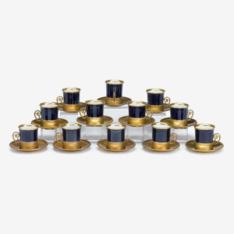 Decorated in cobalt blue with gilt rim and gilt metal base, with conforming gilt metal saucers; in original retailer's box. (12).
