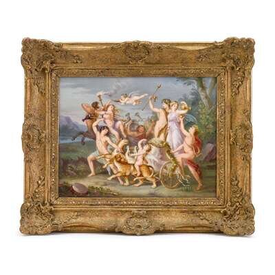 Finely painted to depict a bacchanalian group accompanying a leopard drawn chariot carrying a mythological couple, the obverse impressed KPM below sceptre, 422 2, and with old label.