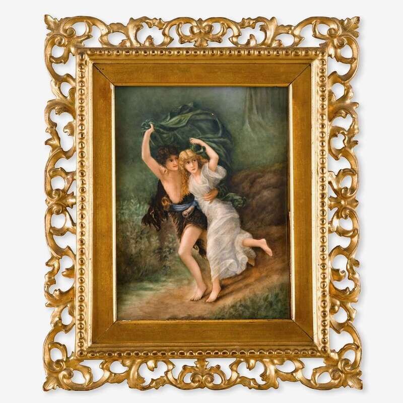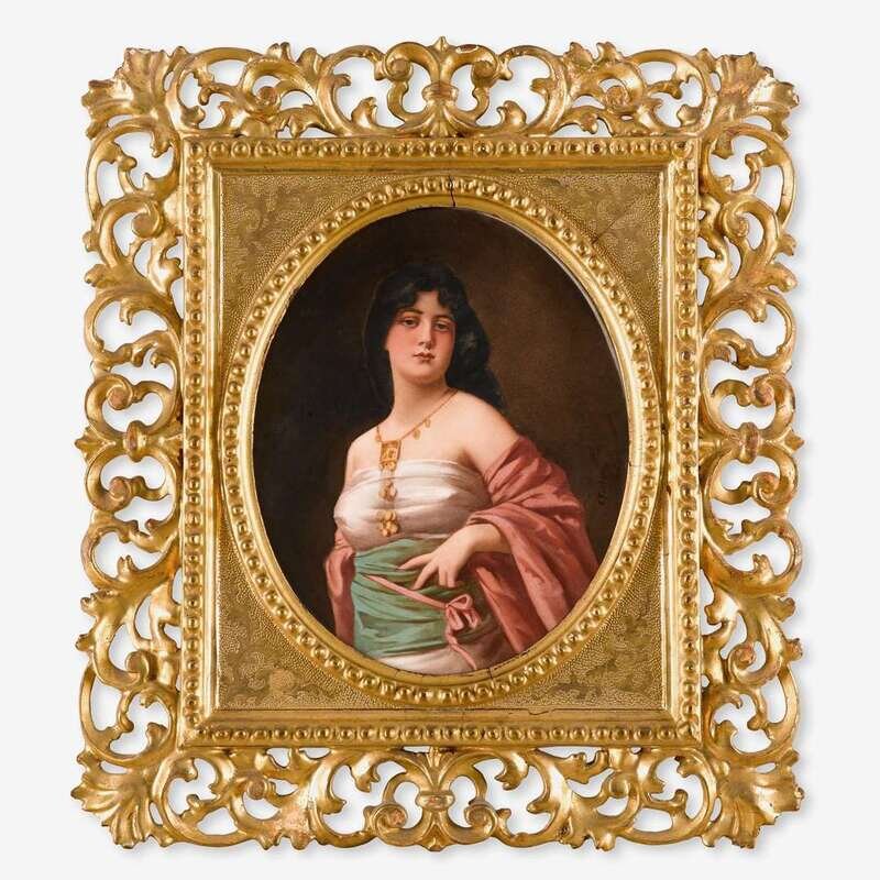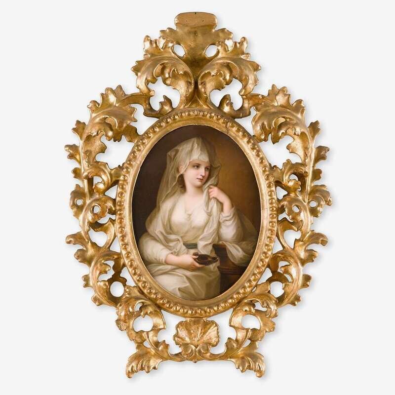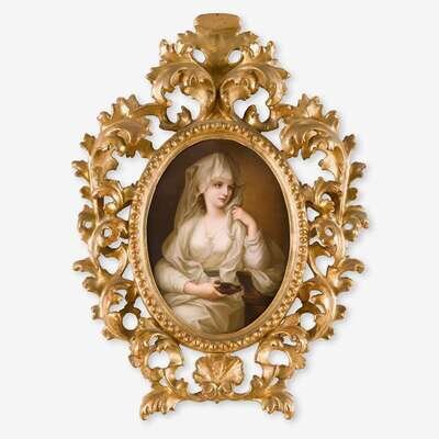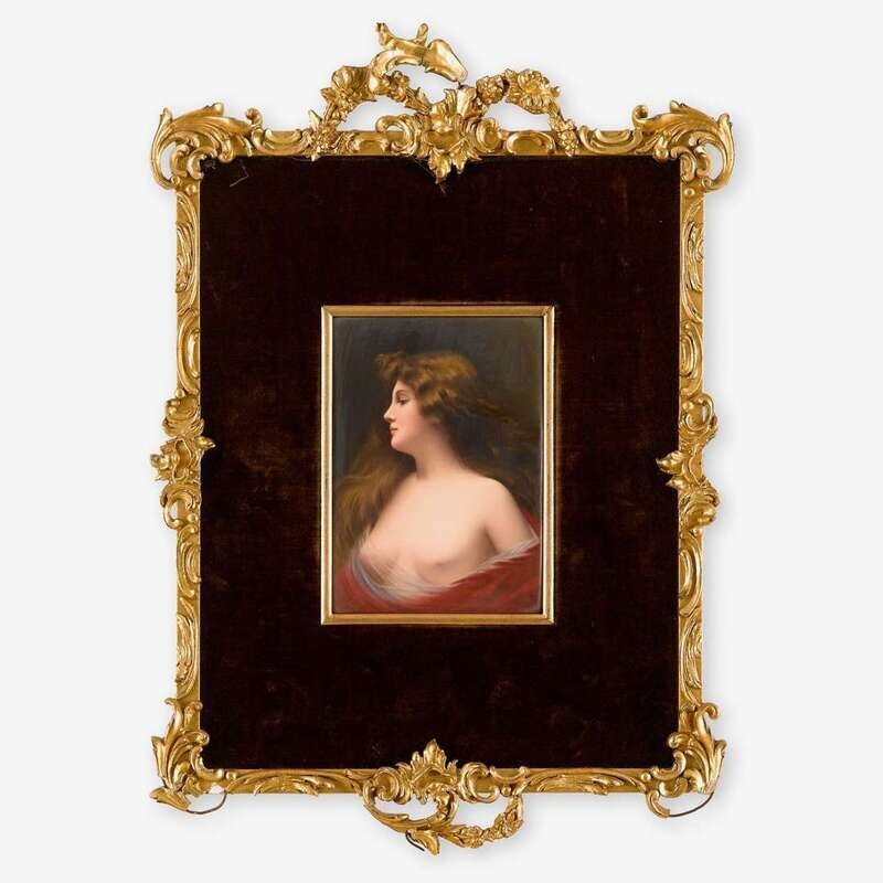 Comprising a KPM style oval plaque depicting a Vestal virgin in gilt wood frame, a rectangular KPM style plaque painted to show Erbluth, an oval plaque depicting a beauty, signed E. Furlavy, the verso titled Fleur de Che, with Sèvres, France mark and impressed 20 PP L, and an outside painted rectangular plaque, impressed KPM 237 158 with sceptre mark to verso. (4).