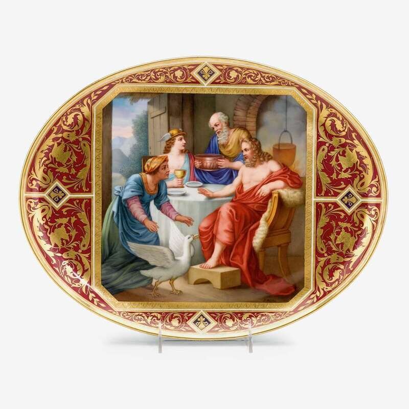 Finely painted to show Mercury and Jupiter in the home of Philemon and Baucis, signed H. Stadler, within a square panel encircled by gilt arabesques on a red ground, the underside titled and with blue beehive mark.
