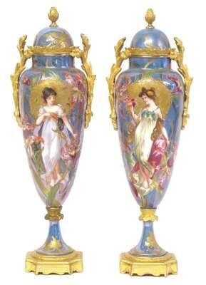 Domed top surmounted by pine cone finial, the vase mounted with gilt metal foliate handles and painted to show a fairy amidst flowers, each signed Lix, raised on gilt metal plinth marked France to underside, the vases with spurious Sèvres mark to base. (2).
