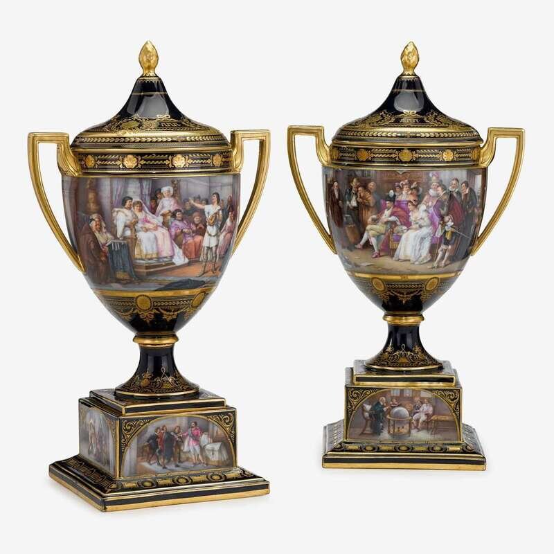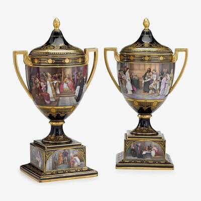 The covers surmounted by gilt finial, the twin handled urns finely painted with continuous vignette composed of two royal court scenes, each titled on underside and signed J. Gunt, raised on conforming socle and square pedestal base painted to each side with further interior scenes, the bases titled in black script, with painter's marks for scenes to base and bearing Franz Dörfl mark and spurious Royal Vienna mark, one with Russian retailer's mark. (2).