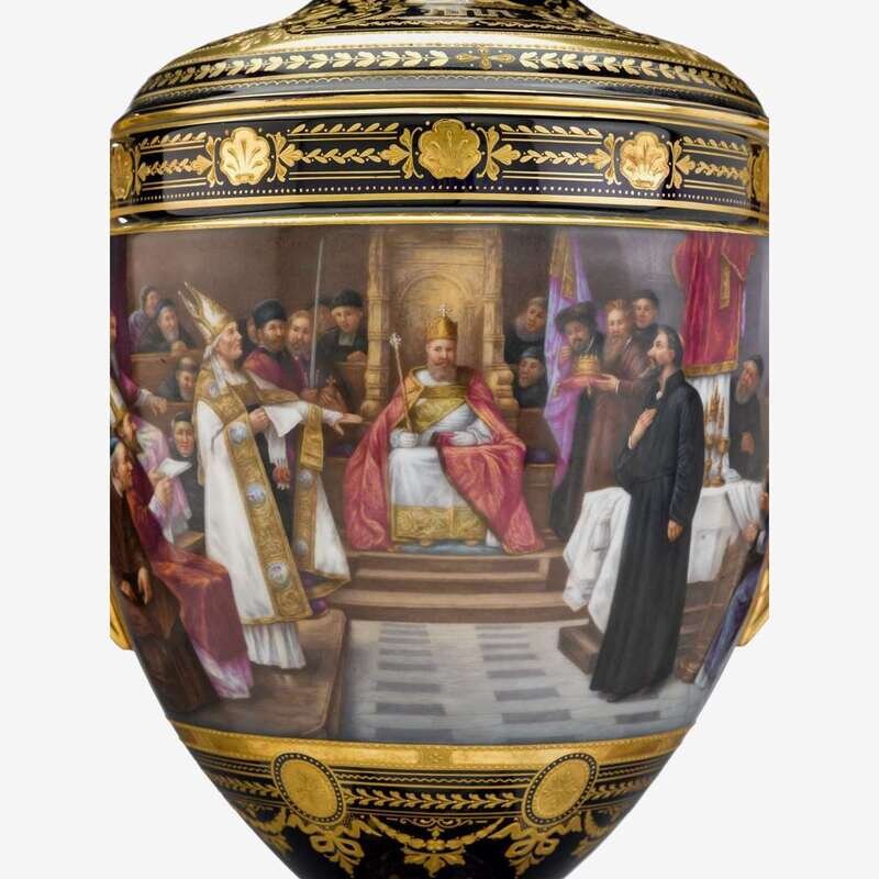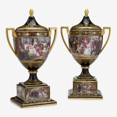 Fine pair of Vienna style cobalt ground porcelain urns and covers Franz Dörfl, late 19th/early 20th century