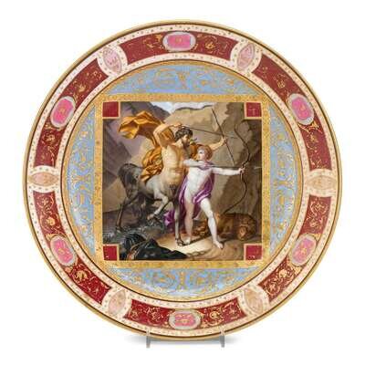 Circular form, finely painted with a central panel depicting Apollo and Chiron, encircled by raised gilt arabesques against a blue ground to the well and claret ground to the rim, the base with Royal Vienna mark.