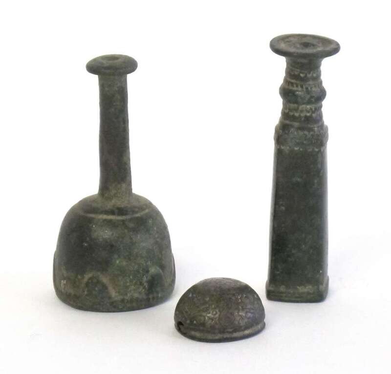 Composed of a central tube surmounted by a janus head and flanked by mythical creatures; together with two Luristan bronze finial stands and an early Islamic engraved button. (4).