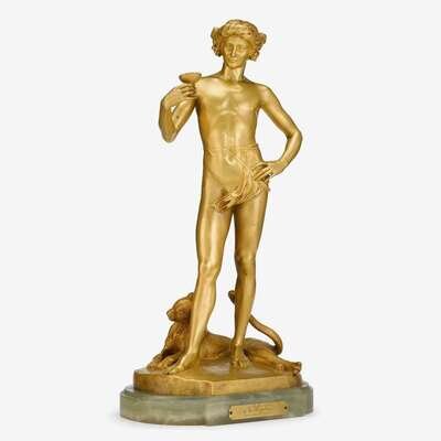Gilt bronze, in the form of Bacchus holding a chalice and standing before a recumbent panther, raised on shaped bronze base and further marble plinth bearing a presentation plaque, the shaped base signed in cast Antonin Carles, Paris 1903 and Siot-Paris, U296.