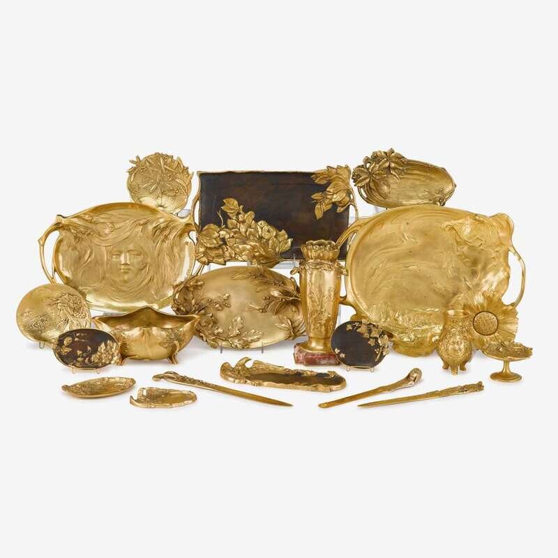 Comprising two large trays, a vase on marble base, a footed bowl, six parcel gilt and patinated bronze dishes and one tray, two doré letter openers and four page turners, a frame, watch stand, clock, six small doré dishes and three larger dishes and four other pieces of various forms, many signed in cast and some with foundry marks; together with a bronze doré and glass ink stand, ink well and paper weight. (approx. 36).