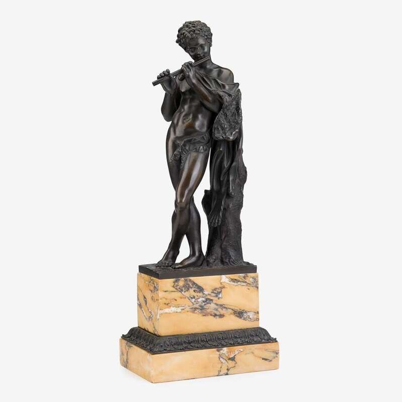 Dark brown patina, depicting a standing figure of Pan playing the flute, a lion skin loosely draped over his shoulder with trailing sashes extending to his mid-section, raised on siena marble tablet on bronze mounted marble base.