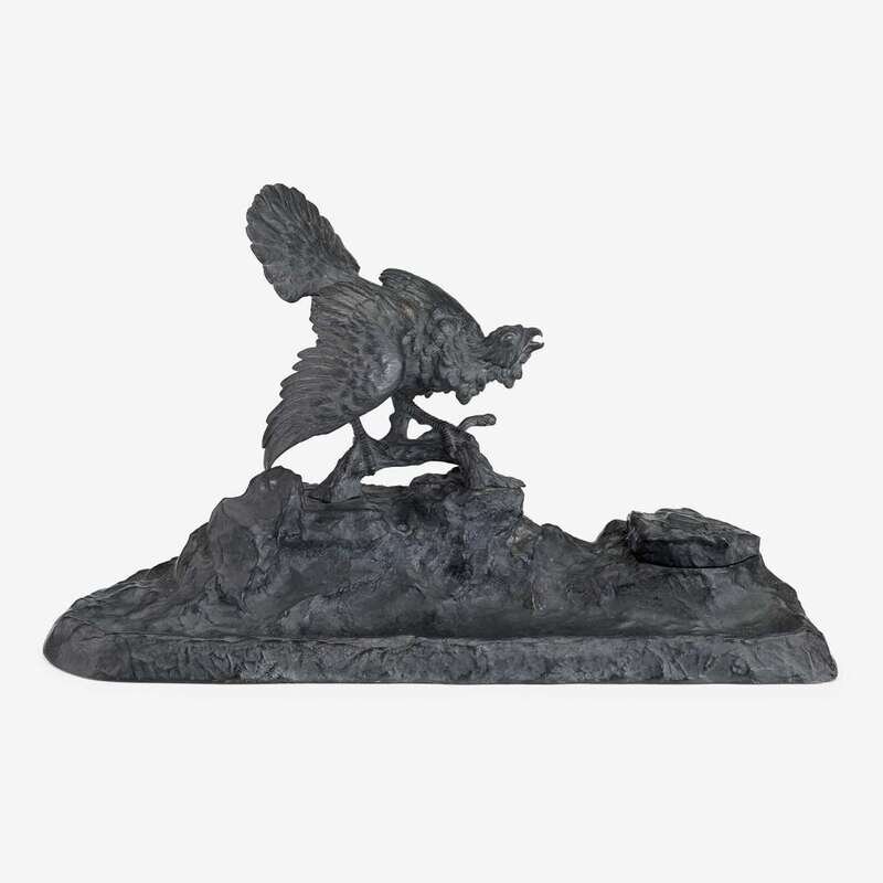 Cast as a turkey atop a naturalistic base, a rock to one side opening to an interior well for an inkpot, the reverse signed in cast Namgreb below Bergman amphora.
