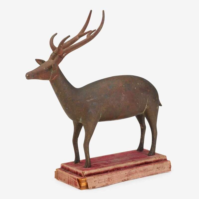 Cast with rounded body and elongated antlers, on velvet covered stand.