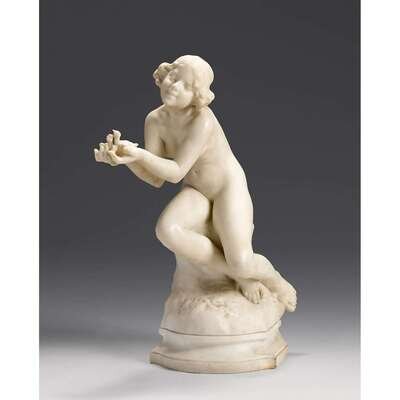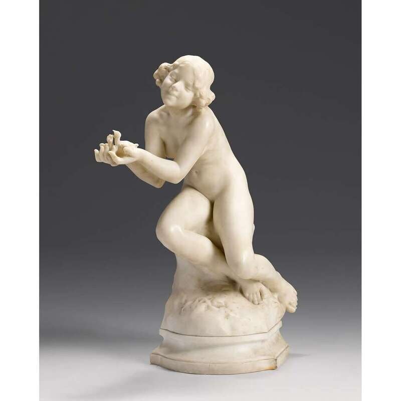 White marble figural group depicting a female nude with chicks, signed A. Gory.