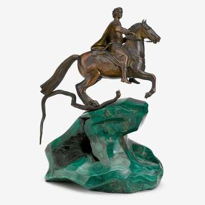 Bronze and malachite, after the monument in St. Petersburg depicting Peter the Great on horseback atop the thunder stone.