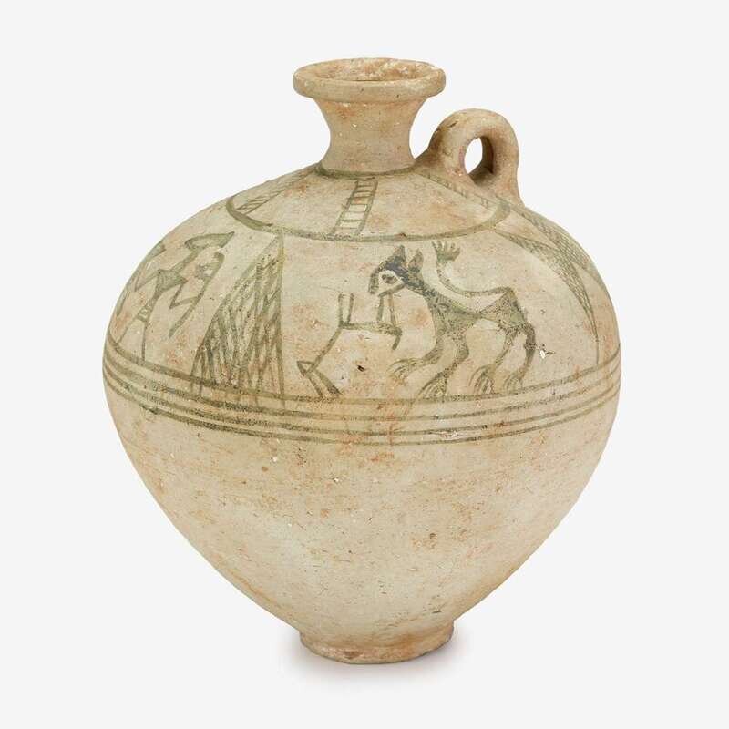 Globular body with a short neck and single loop handle, monochrome painted with a frieze depicting a hunter, lion and antelope interspersed with cross hatched triangles.