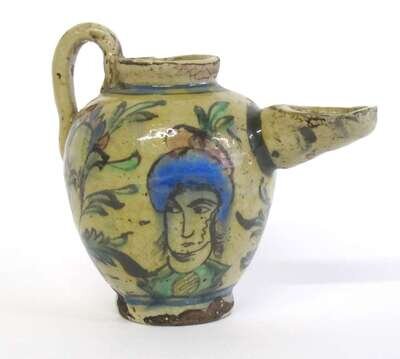 Painted underglaze with a portrait of a man opposite a foliate spray, mounted with a loop handle and wide spout open to the top.