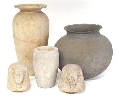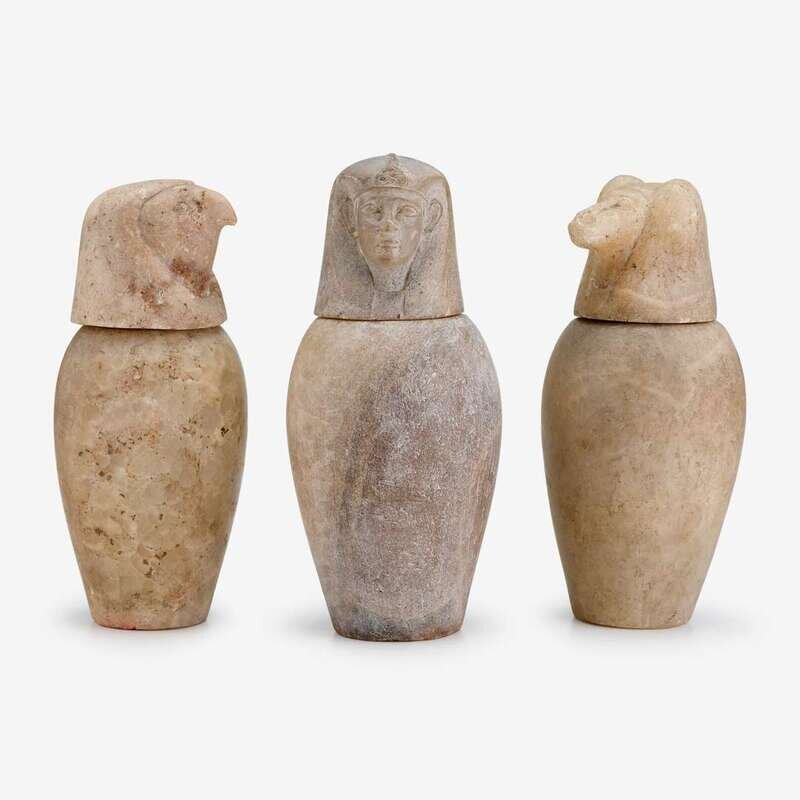 Cylindrical form, the rounded vessels each surmounted by a cover sculpted in the form of one of the three sons of Horus, including baboon-headed Hapy, human-headed Imsety and hawk-headed Qebehsenuef; together with two additional jars, two covers in the form of Imsety and a grey pottery jar. (8).