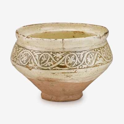 Squat form with bulging sides and slightly everted rim, partially glazed in white slip, the shoulder incised and decorated with brown slip to show foliate tendrils against a linear ground, some traces of green to rim and shoulder, the lower half unglazed, raised on a short foot.