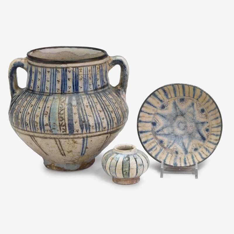 Tapering bulbous body with a short neck mounted with twin handles, painted in cobalt, black and turquoise underglaze to show a frieze comprised of panels stippled with dots enclosed by three vertical bands; together with a footed bowl painted in cobalt and black with vertical lines above a star to the well; and a small lustre glazed pottery jar. (3).