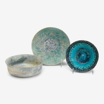 Comprising a conical bowl raised on a short foot, turquoise glazed and slip-painted with a seated figure to the well beneath a border of kufic script, the exterior with foliate decoration; a conical bowl, glazed in turquoise lustre and molded with a linear frieze to the interior; and a shallow lustre glazed bowl. (3).