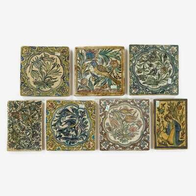 Comprising five square tiles and two rectangular tiles painted to depict various flowers, birds and a figurative scene. (7).