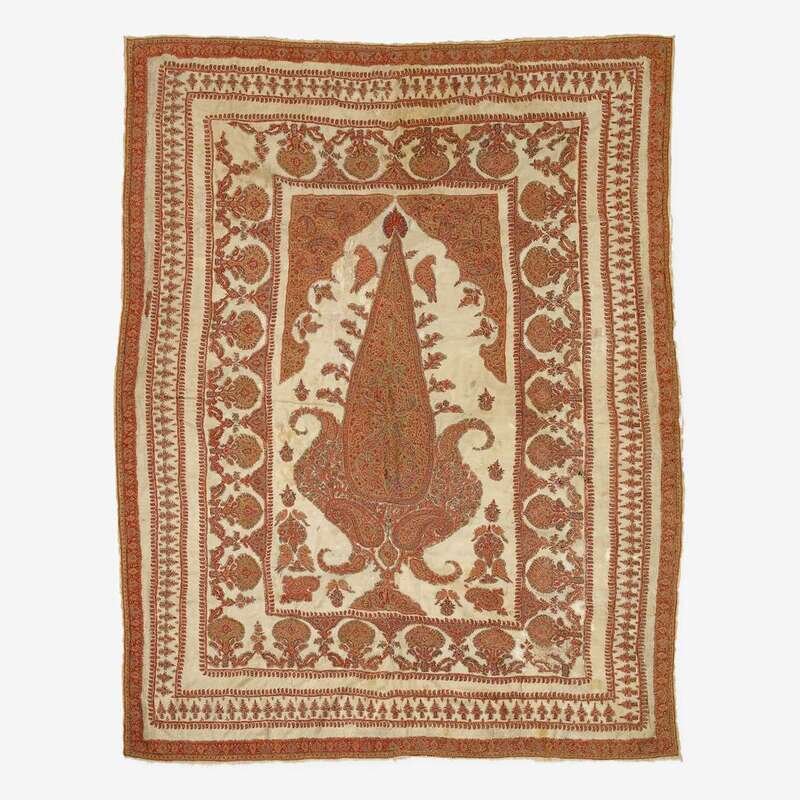 Embroidered to show a central cypress tree flanked by pairs of birds within a scalloped niche, all within outer borders comprised of various stylized flowers and boteh.