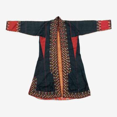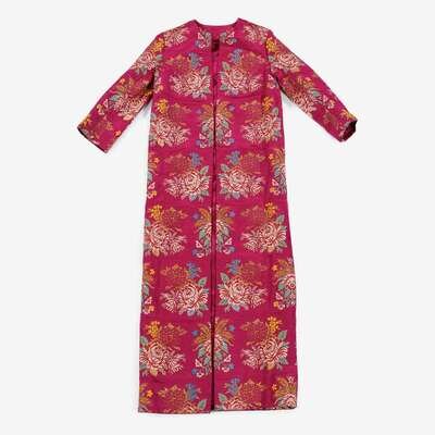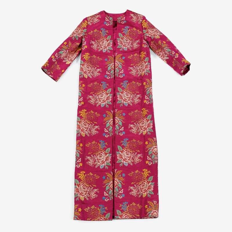 The silk ikat with fuschia, purple, yellow and white abstract and saw tooth designs and needlework binding, the chrypy with red, white, yellow and maroon needlework designs; together with a robe in a bekasab stripe, and a woman's robe embroidered in colored silks with floral sprays. (4).
