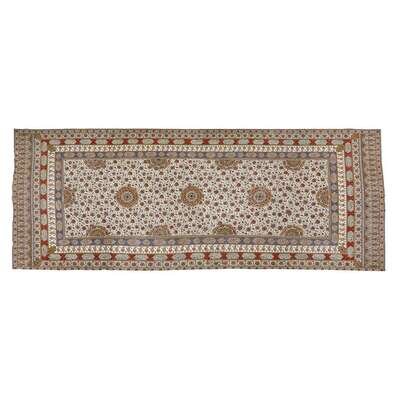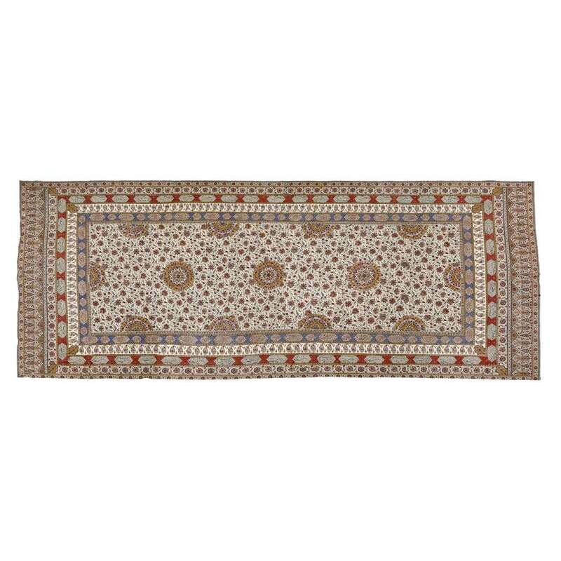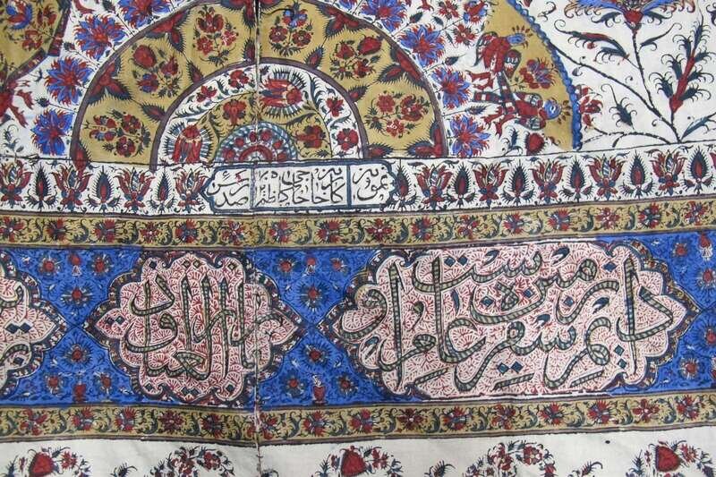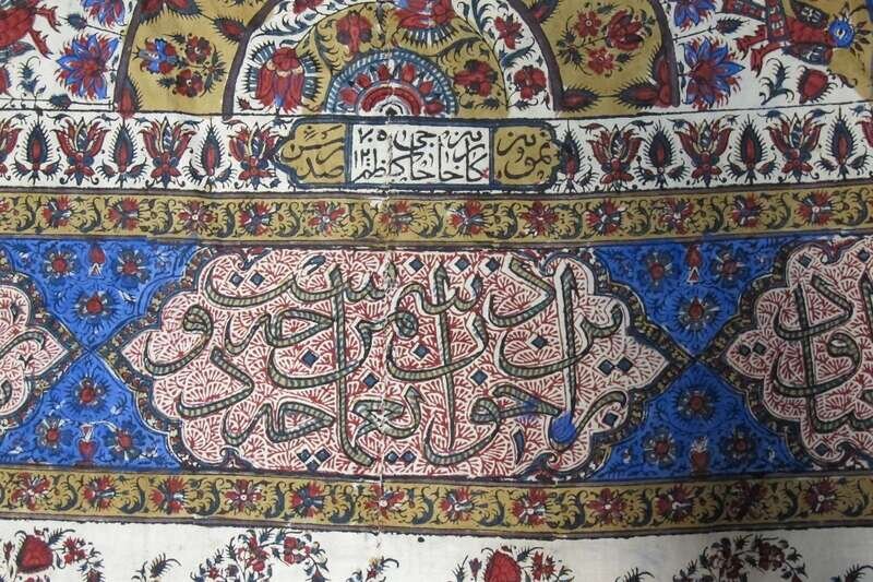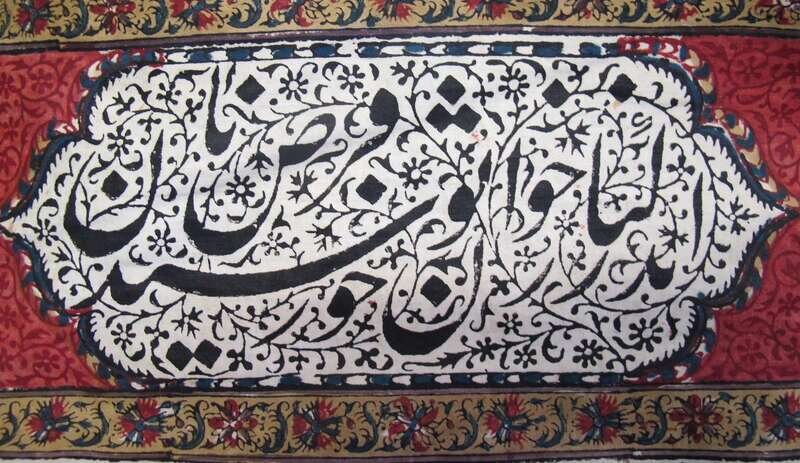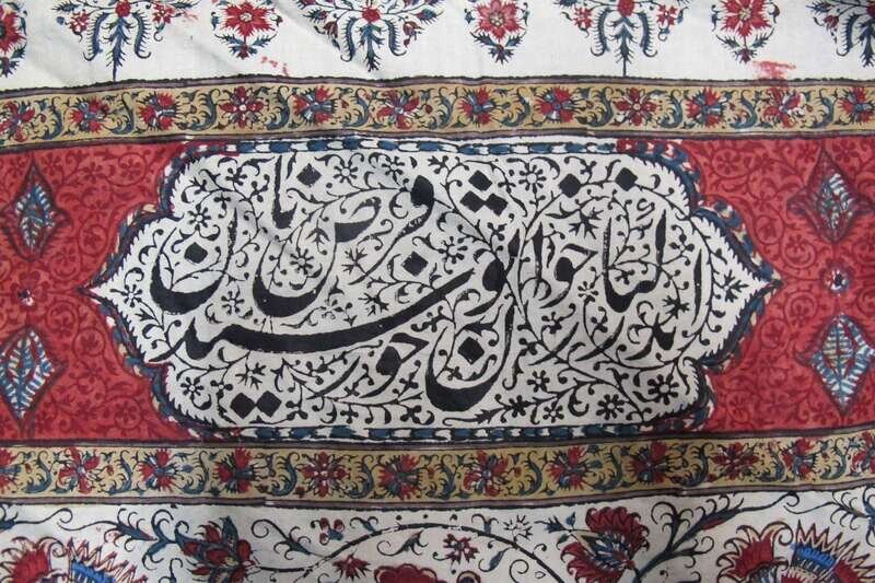 Block printed and hand painted with medallions against an arabesque within borders containing medallions painted with calligraphic inscriptions in nastaliq interspersed with foliate and boteh borders, dated 1200 or 1210 AH in inscription.
