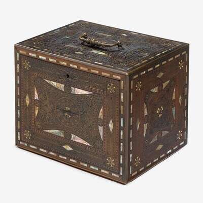 Rectangular form, inlaid in brass, copper and mother-of-pearl with foliate motifs and star centered medallions, the fall front opening to eight small drawers.