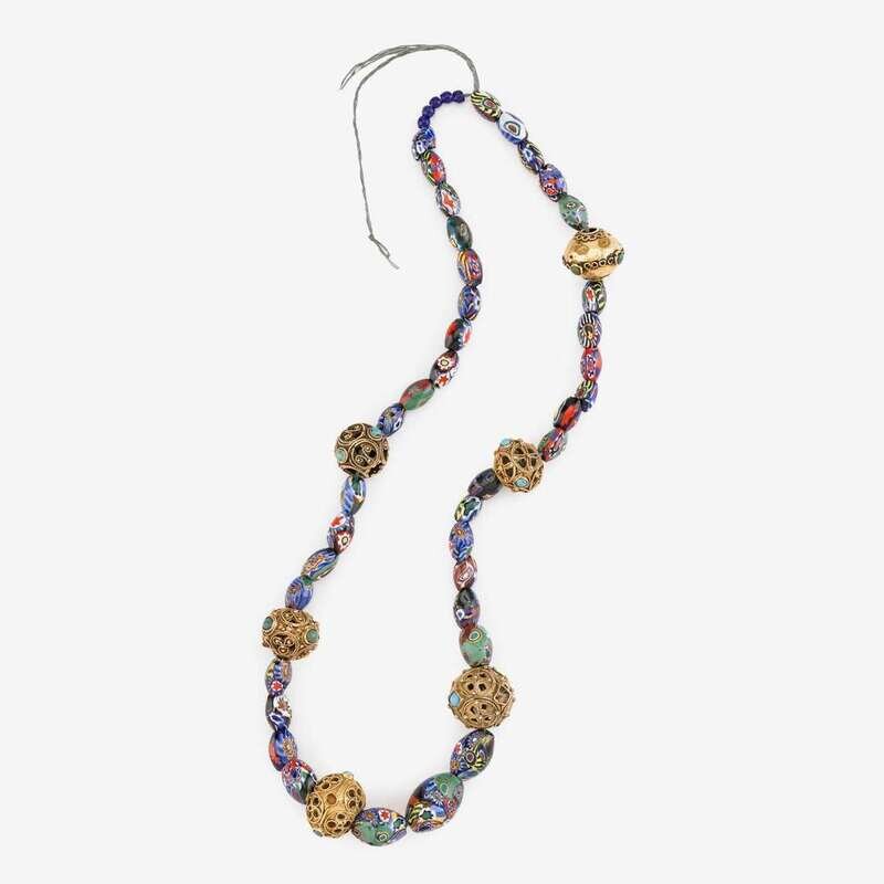 Comprised of six reticulated 22 karat gold beads decorated in filigree and mounted with turquoise and glass cabochons, interspersed with glass beads.