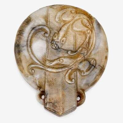 of flattened circular form with protruding blade and openwork rings, carved in relief to show a chilong and archaic pattern verso, stone of fatty white hue with brown and black streaked inclusions.