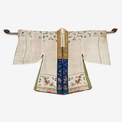 with wide sleeves and trimmed with the long collar typical of priestly robes, embroidered on the white brocade silk ground to show auspicious symbols and creatures as well as roundles displaying figures and scenes from the daoist tradition.