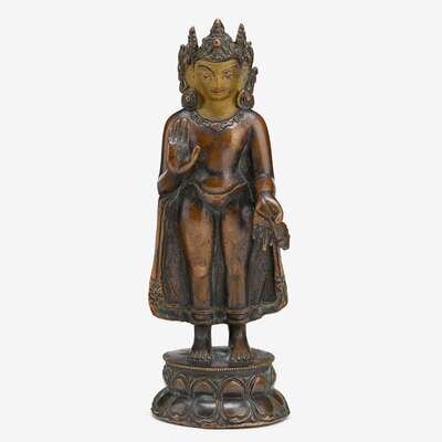 standing on a lotus base, his right hand raised in the fear-abiding gesture, left hand lowered in a gesture of compassion and holding a jewel, wearing a tightly fitted robe cascading concentric folds down the front and revealing the sensitively modelled limbs, the face with pensive expression, the hair is pulled up into elaborate coiffure behind a five-point foliate crown.