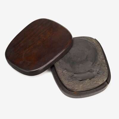 of square form with rounded corners, carved to show a pine and a fu bat among moving clouds, fitted to a wooden box.
