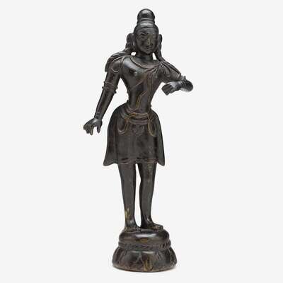 standing in abhanga on a round lotus base, his left arm bent and by his side, right arm raised with palm facing down, dressed in a diaphanous dhoti secured with a belt, his face with serene expression.