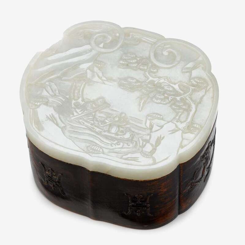 lobed to resemble a ruyi, the box carved to show "shou" characters to front and back and archaic style dragons to sides, mounted by fitted white jade lid carved to show one of the Eight Immortals rafting on water with his flower basket on board in a moutainous landscape, jade of translucent white.