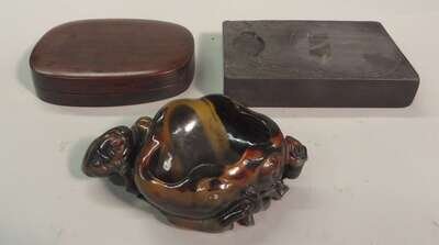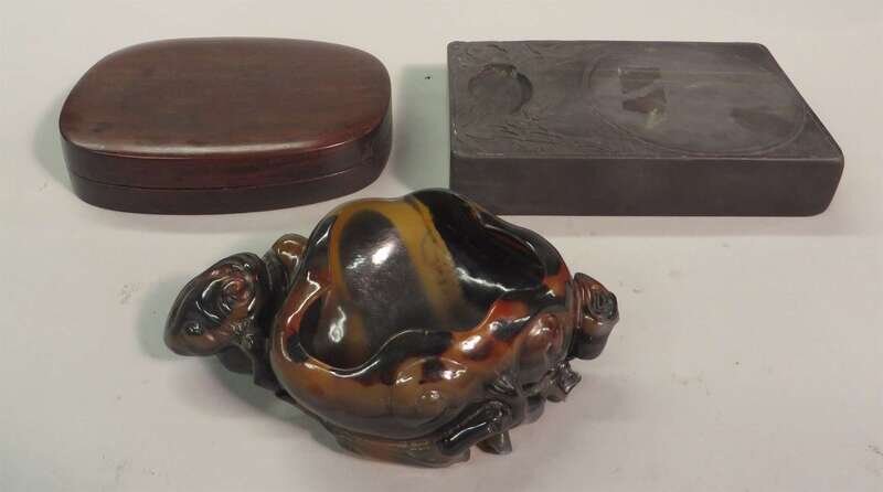 comprised of a purplish-brown stone carved to show a fiery pearl amidst crashing waves to top and a fitted wooden box, a lingzhi formed water coupe, and a rectangular ink stone carved to show bamboo and cloud to top (3).
