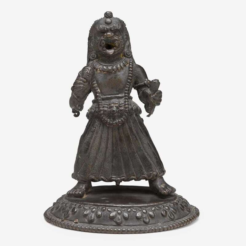 cast to show the menacing deity holding a human's head in the right hand and a human's hand in the left, standing over a single floral decorated base.