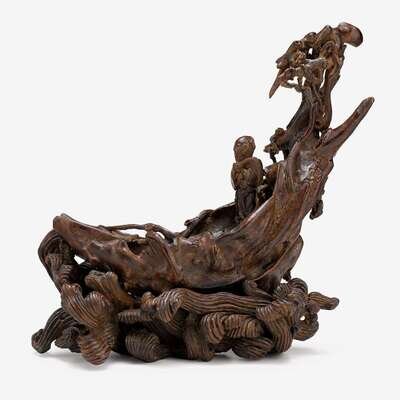 finely carved to show a daoist figure standing in a crescent formed boat, elaborately adorned with intertwining branches, fitted to a base carved as turbulent waves.