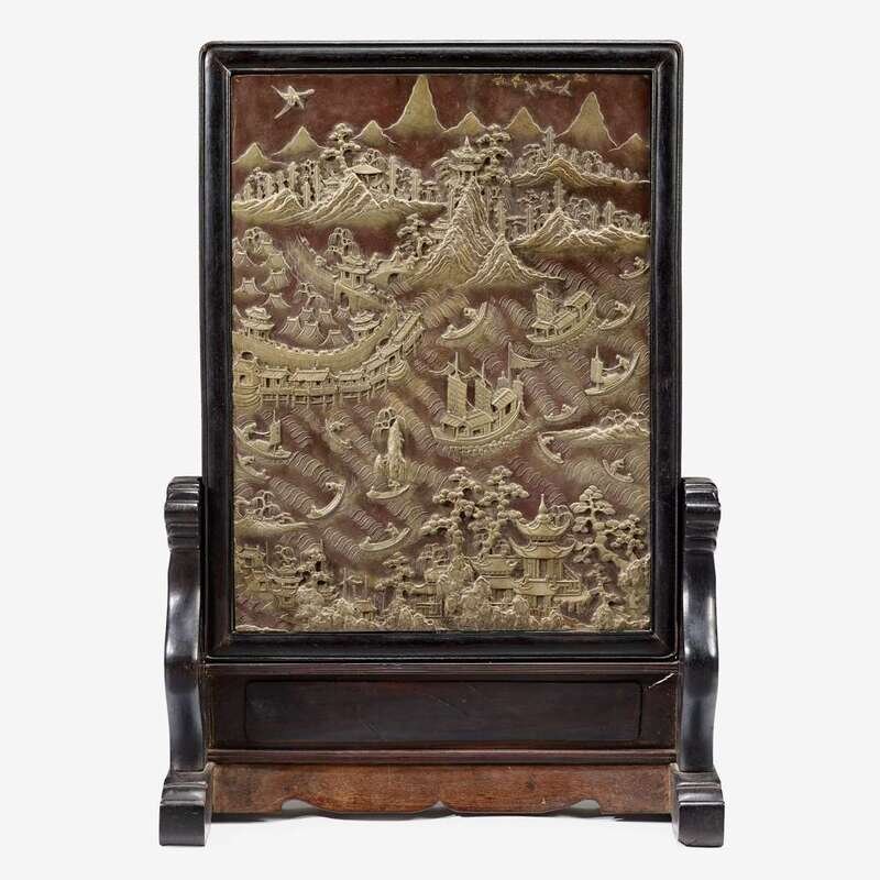carved in high relief to show fisherman and various boats and ships in a river amidst mountainous landscapes, stone of dark reddish-brown and beige, attached to hardwood frame and fitted stand.