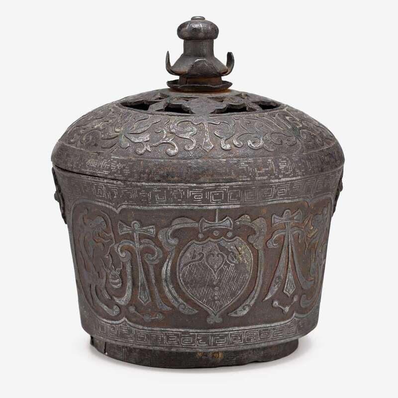 lacqured to interior, decorated to pierced cover with lotus designs and to exterior with auspicious symbols within reserves, inlaid silver key ground and details.