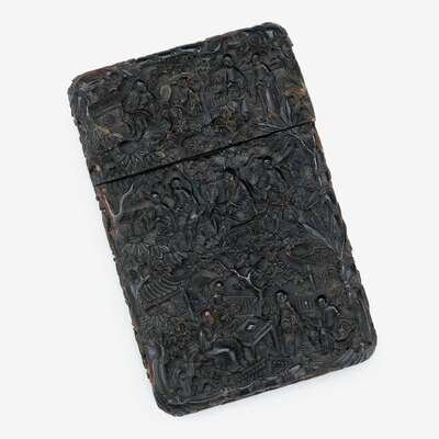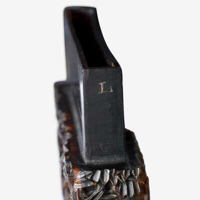 of typical shape, finely sculpted on all sides to show civilians and scholars in a garden like setting, carved to one side of inner rim with the letter "L" and the other side with one character mark reading "sheng"