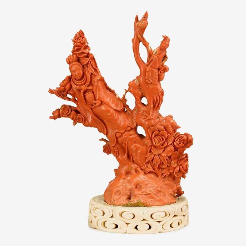 delicately carved to show a beauty leaning on a prunus branch, flanked by peony flowers to sides as well as to base, topped by an acolyte riding on a crane, mounted over a carved ivory base.