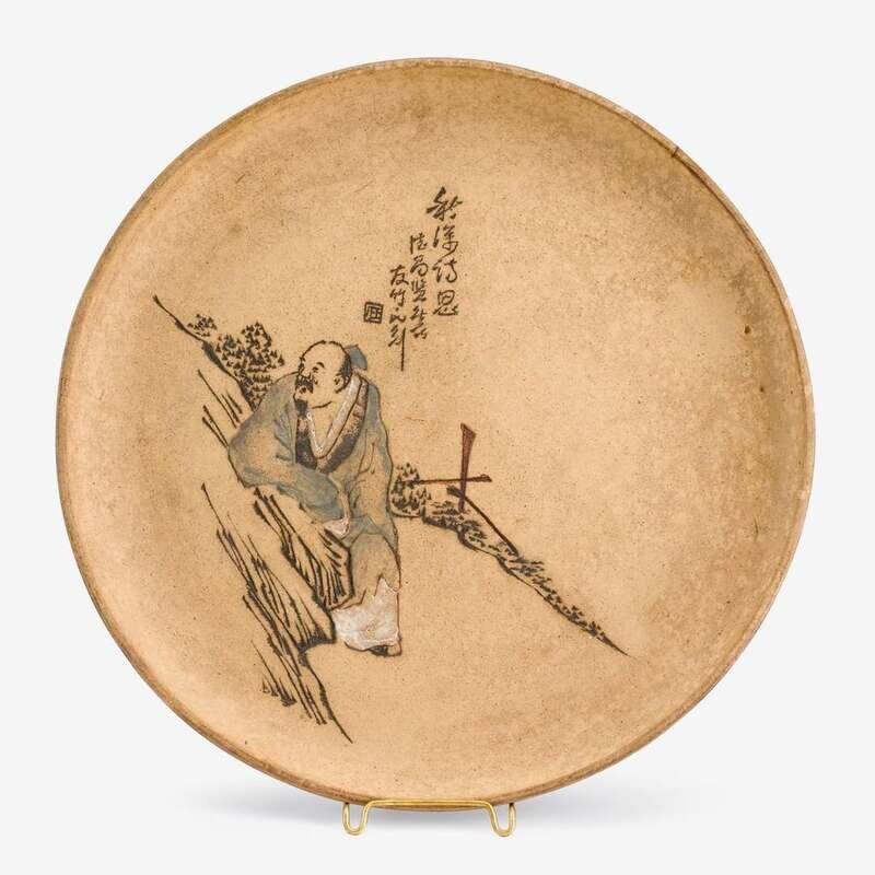 of shallow form, inscribed and enameled to surface with a scholar leaning against a rock, obscure mark to base.