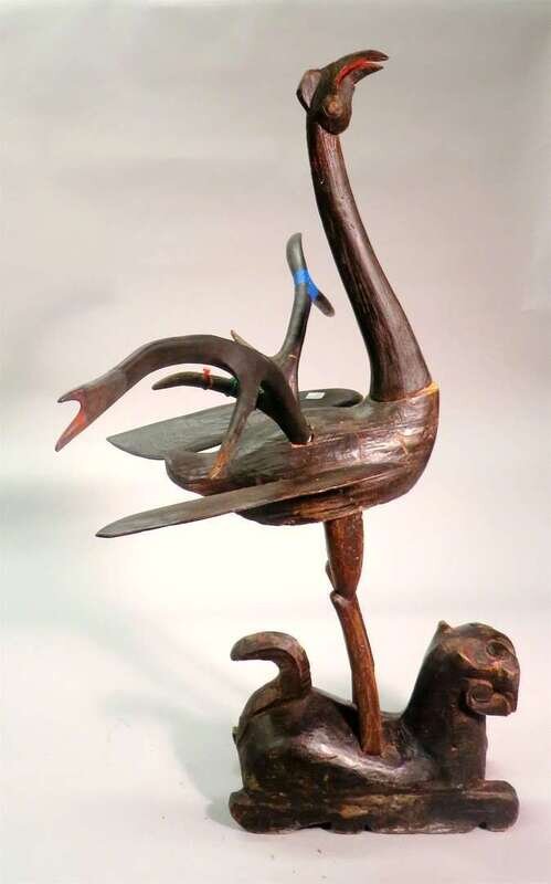 of archaic and simple form, the bird stands over the recumbent tiger with its beak raised, uniquely attached with deer antlers to body, traces of paint pigments to body.
